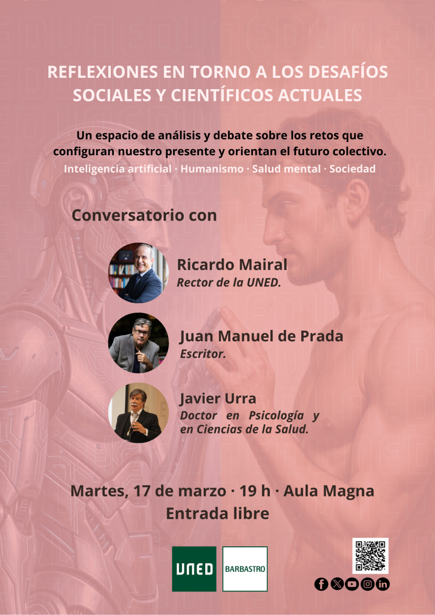 Reflexiones en torno a los desafíos sociales y científicos actuales. Un espacio de análisis y debate sobre los retos que configuran nuestro presente y orientan el futuro colectivo 02/03/2026 Conversatorio con: Ricardo Mairal. Rector de la UNED. Juan Manuel de Prada. Escritor. Javier Urra. Doctor en Psicología y en Ciencas de la Salud. Martes, 17 de marzo, 19 h, en UNED Barbastro. Entrada libre Ver cartel