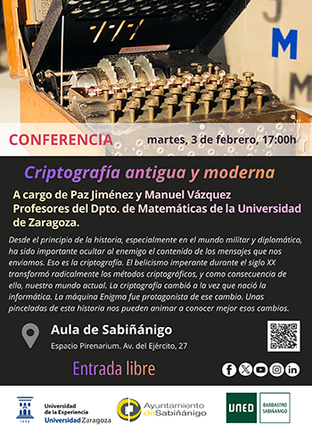 - Sabiñánigo: Criptografía antigua y moderna por Paz Jiménez y Manuel Vázquez.