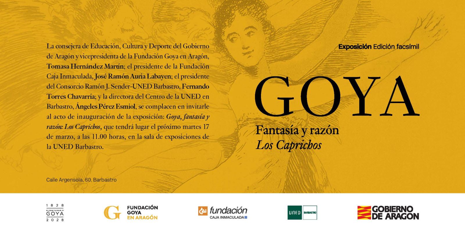 Acto de inauguración de la exposición Goya, fantasía y razón: Los Caprichos, tendrá lugar el próximo martes, 17 de marzo, a las 11.00 horas, en la sala de exposiciones del Centro de la UNED de Barbastro.