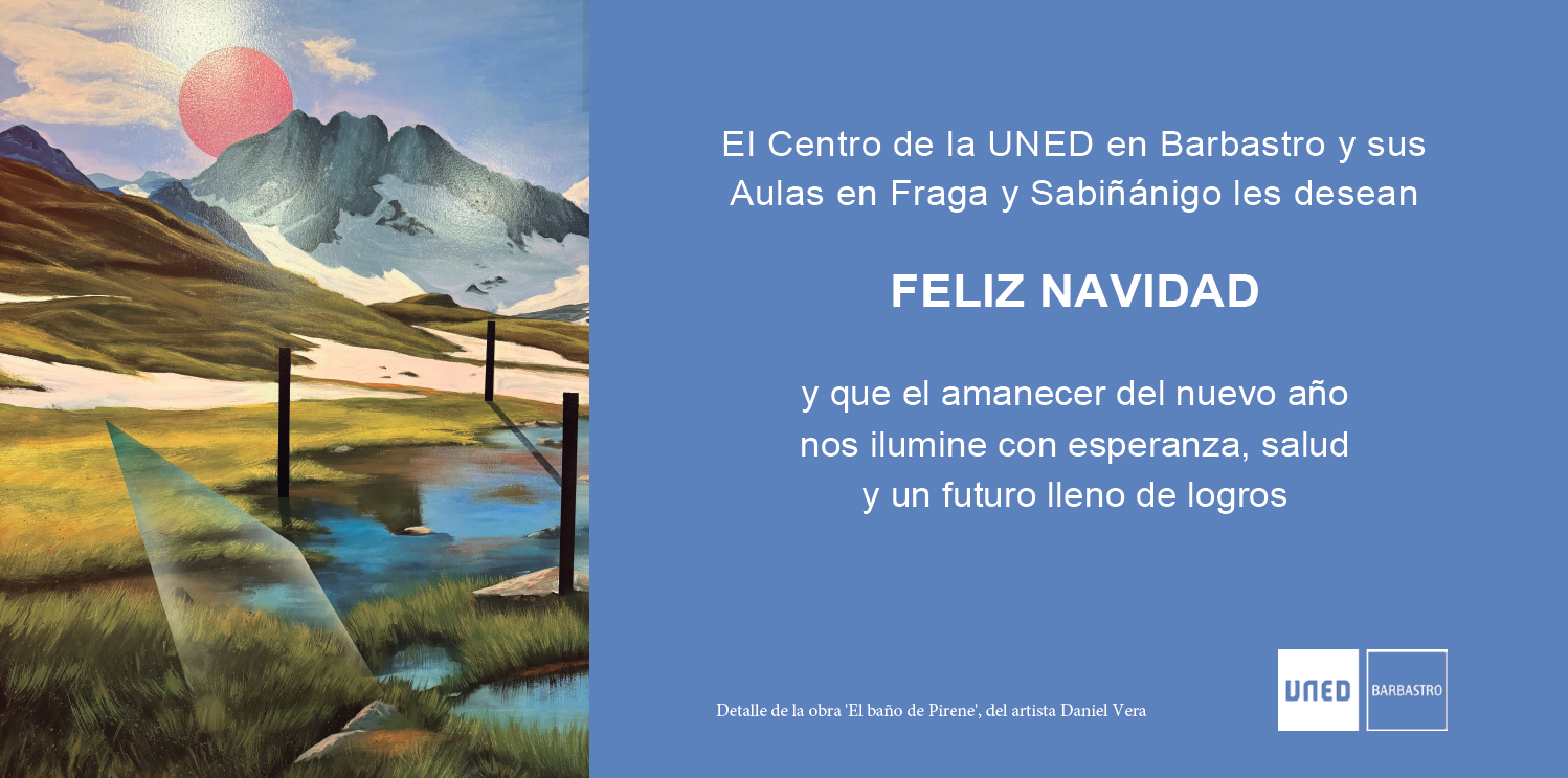 En estas fechas tan especiales, desde el Centro de la UNED de Barbastro y sus Aulas en Fraga y Sabiñánigo queremos transmitir nuestro más cálido deseo de una Feliz Navidad a toda nuestra comunidad educativa. Que esta Navidad nos brinde momentos de paz, alegría y reflexión.